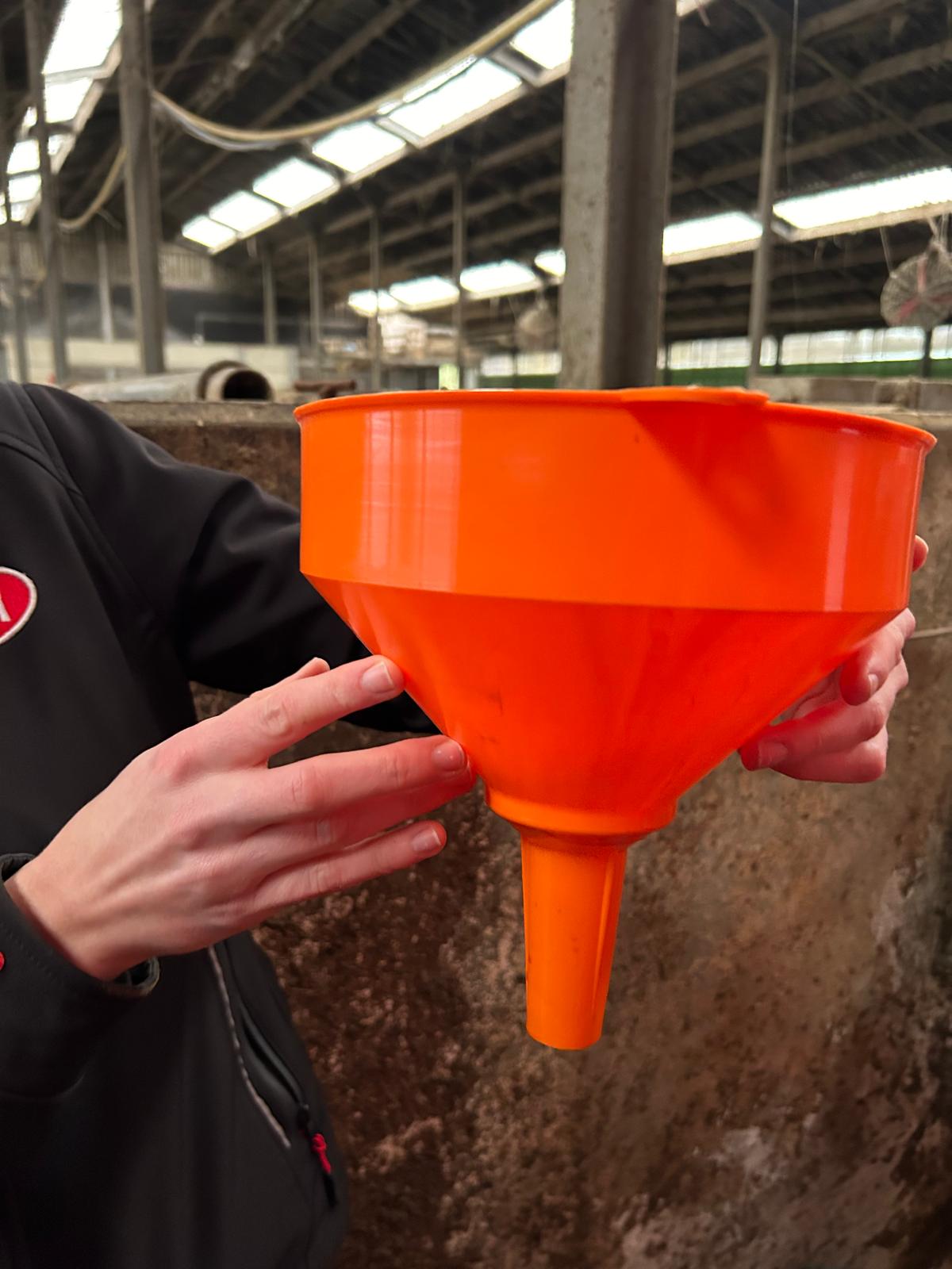 Bij gebruik van de Lely Quaress Barrier spray adviseren we het gebruik van de trechter met ingebouwd zeefje. Wanneer uw Barrier vat bijna leeg is kan u de trechter op het nieuwe Barrier vat steken en zo de overschot van het bijna lege vat naar het nieuwe vat overgieten.