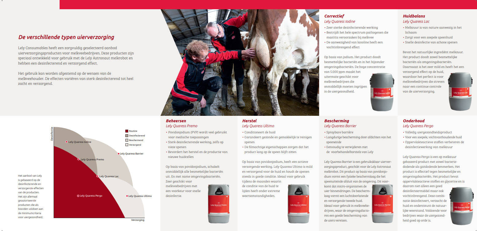 Lely heeft een zorgvuldig geselecteerd aanbod uierverzorgingsproducten voor melkveebedrijven. Deze producten zijn speciaal ontwikkeld voor gebruik met de Lely Astronaut melkrobot en hebben een desinfecterend en verzorgend effect.