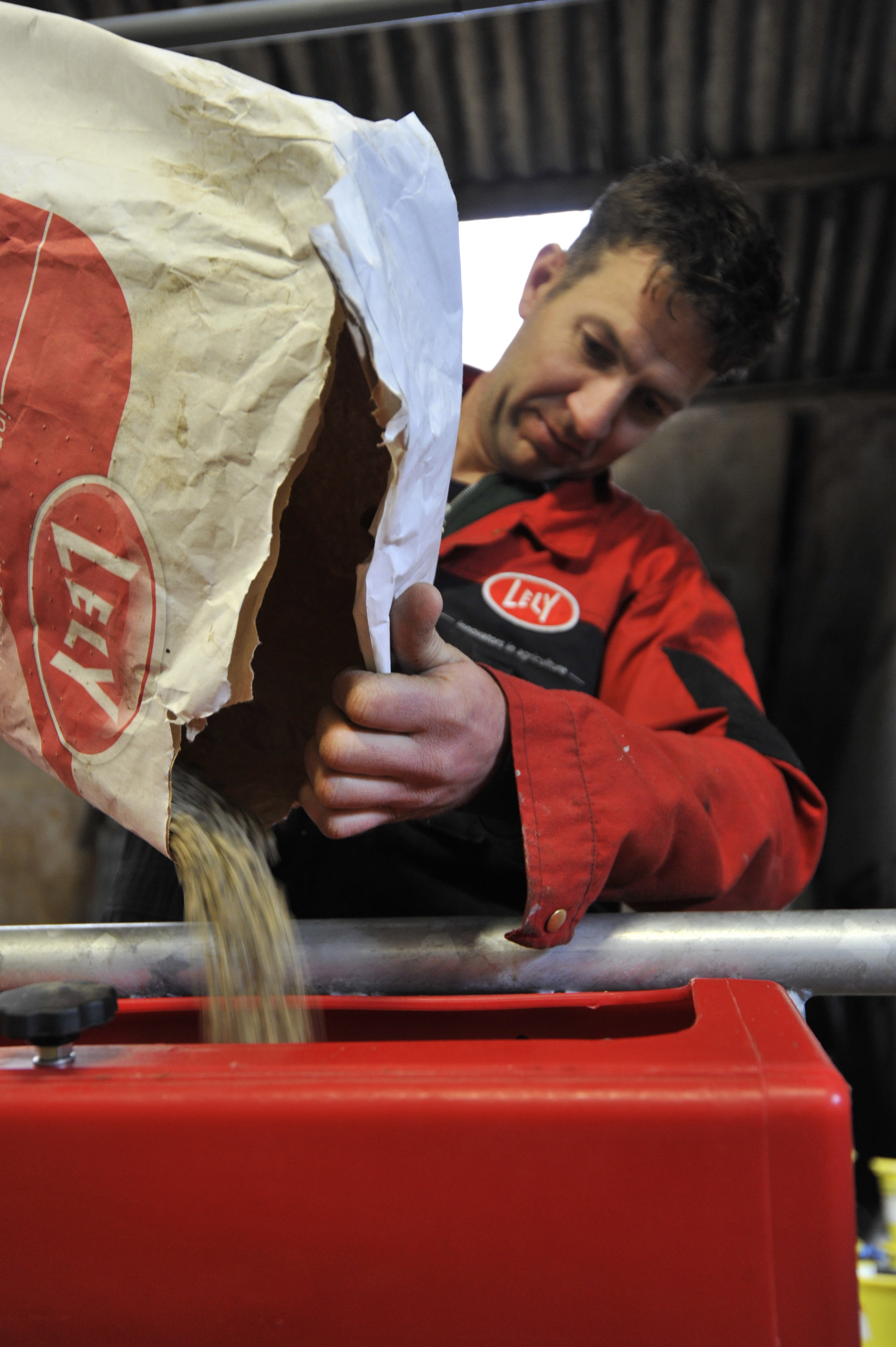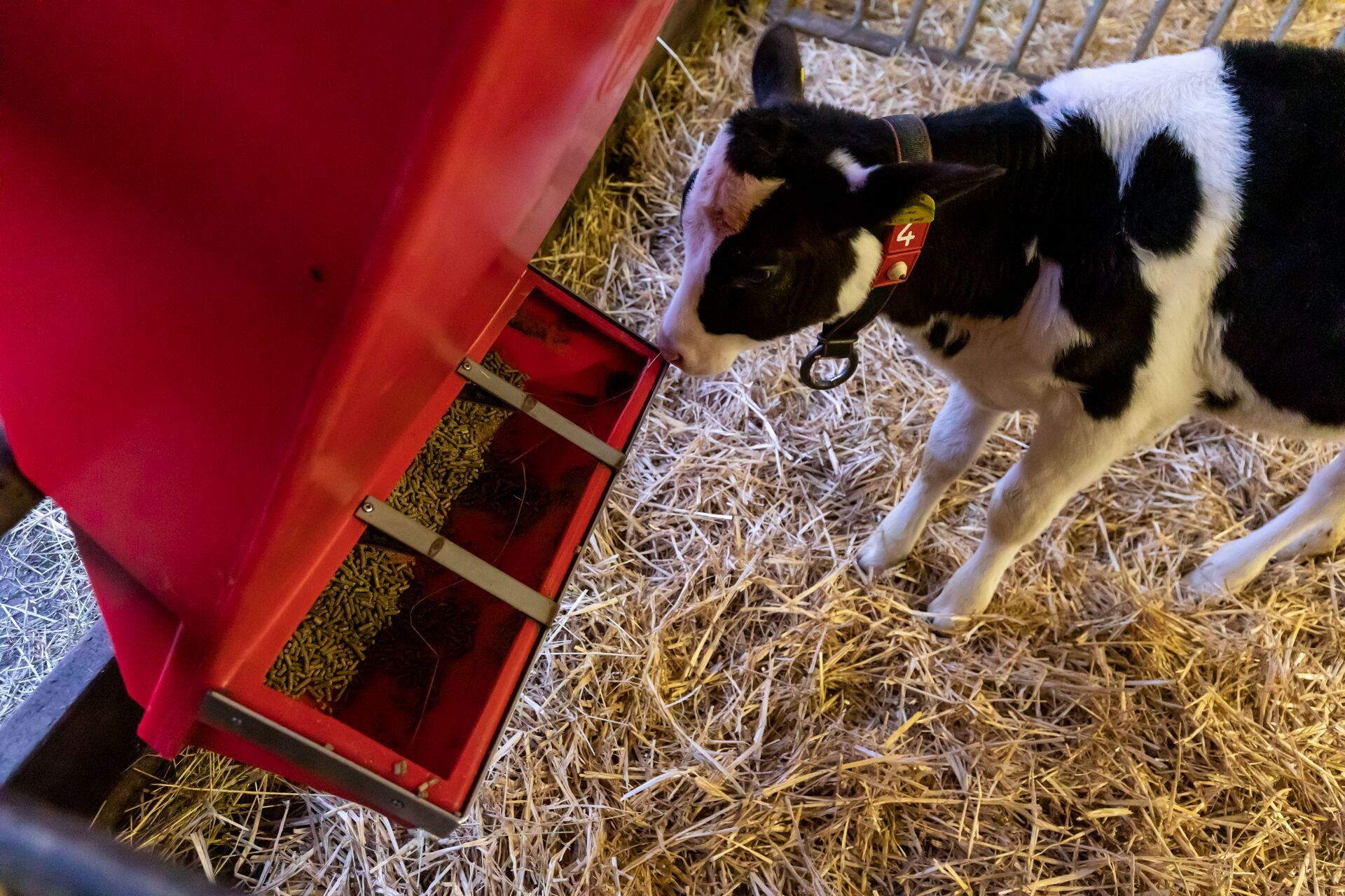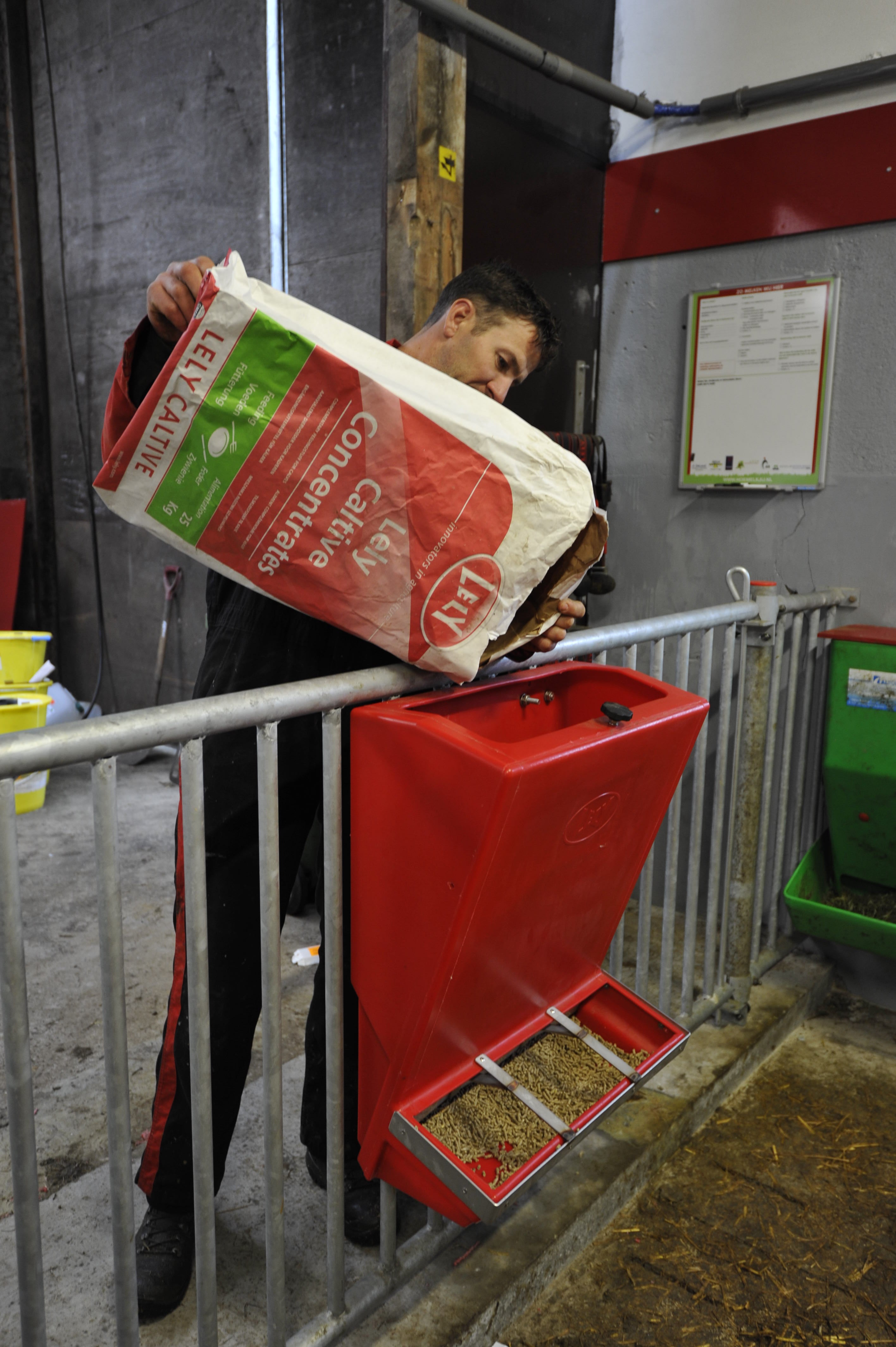 De krachtvoerbak zorgt dat 3 kalveren tegelijk elke keer een kleine portie krachtvoer uit de voorraad kunnen opnemen. Door deze wijze van doseren blijft het krachtvoer vers en smakelijk. Als het portie voer op is, valt er weer een nieuwe portie in de bak.