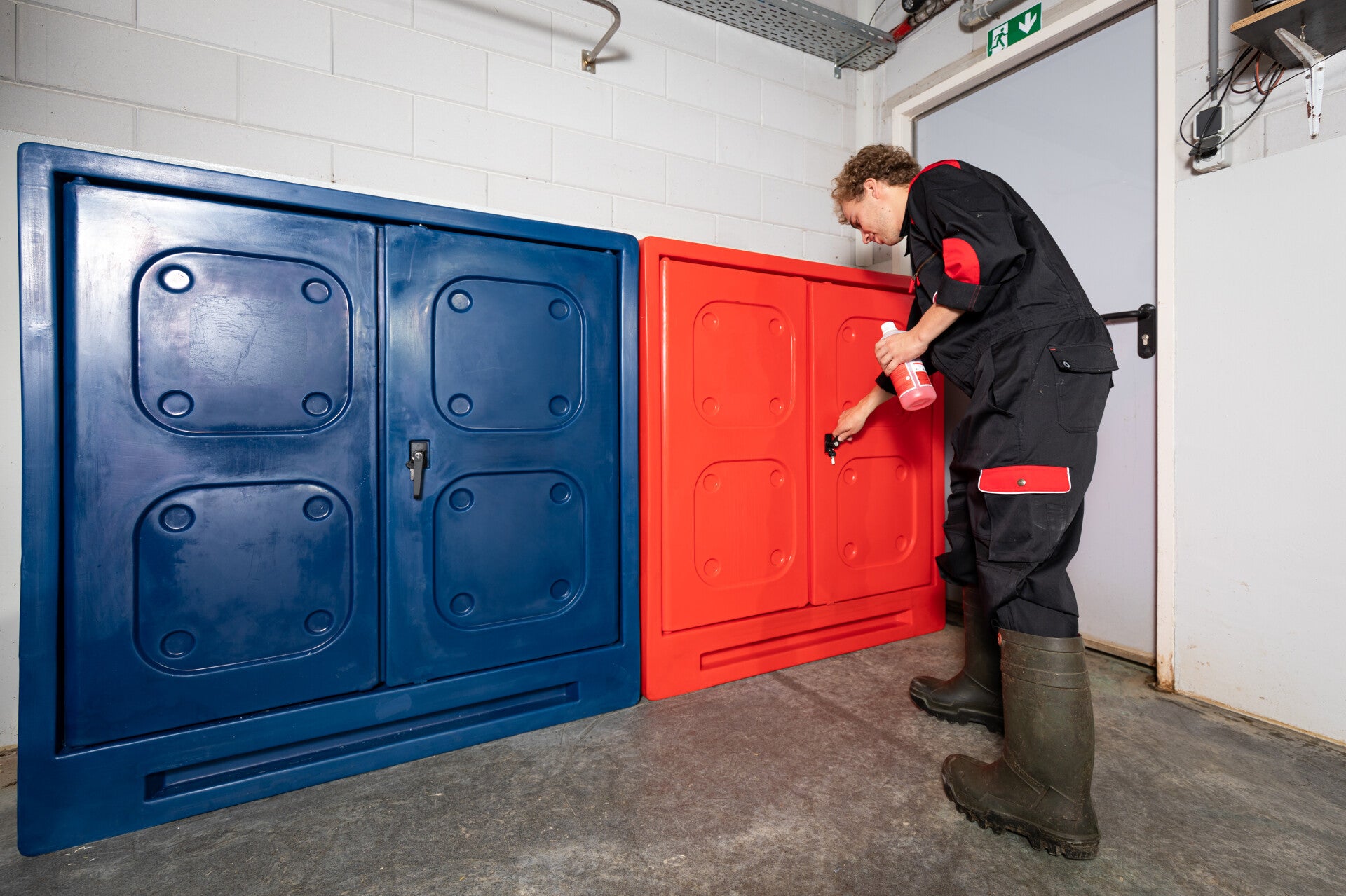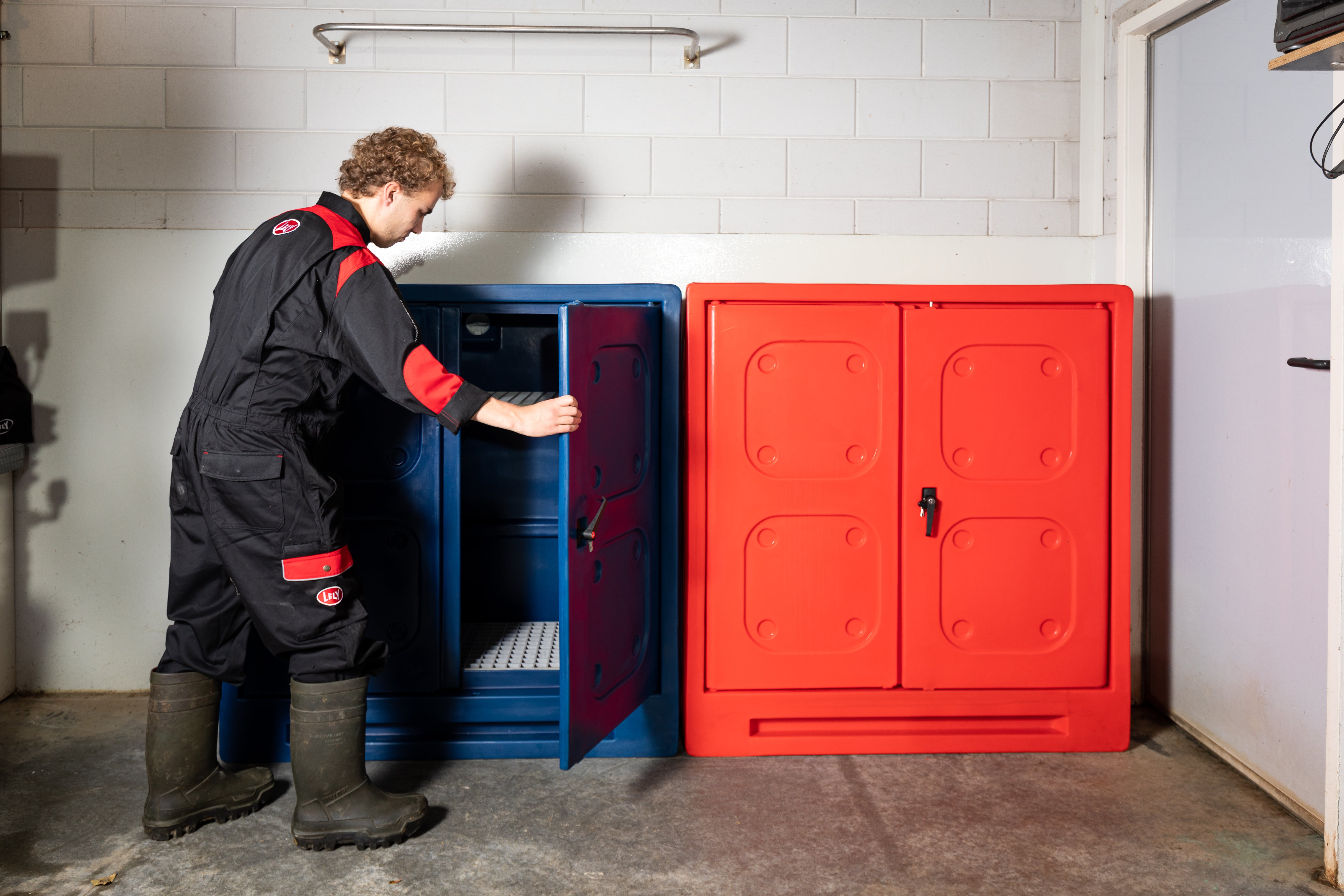 In de opslagkast voor chemicaliën kunnen kleinere chemische materialen en tools voor op melkveebedrijven veilig worden opgeslagen. De opslagkast voor chemicaliën bestaat uit een geïntegreerde lekbak en schappen. De lekbak heeft voldoende capaciteit om flessen of kleine blikken op te slaan. Houd u daarbij altijd aan nationale regels en richtlijnen voor het opslaan van chemicaliën. De opslagkast voor chemicaliën is verkrijgbaar in rood en blauw. Alkalische en zure producten moeten in aparte opslagkasten worden geplaatst, en de twee kleuren verwijzen dan ook naar de kleurcodes op de verpakkingen van Lely. De opslagkast en planken voor chemicaliën zijn volledig gemaakt van polytheen (plastic), zodat in geval van lekken of morsen geen corrosie kan optreden. Ook verlengt het gebruik van sterk polytheen de levensduur van opslagkasten voor chemicaliën, die daarmee een duurzame optie zijn. De deuren zijn voorzien van slot en grendel om te voorkomen dat niet-geautoriseerde personen de kast open maken.
