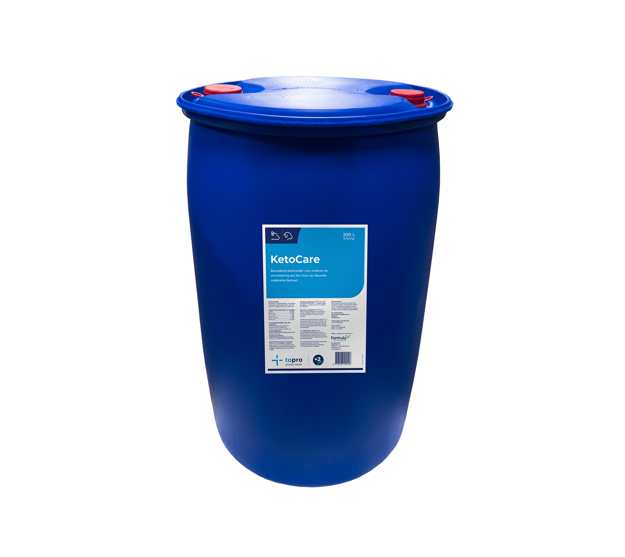 Topro KetoCare is een energierijk product bestaande uit de voedermiddelen propyleenglycol, glycerol en isomaltulosemelasse. Zowel glycerol als isomaltulosemelasse zijn beide erg smakelijk, waar propyleenglycol erg bitter is, en maken dat het zonder problemen wordt opgenomen. Daarnaast vullen beide voedermiddelen het aandeel propyleenglycol goed aan omdat ze minder snel beschikbaar komen voor het dier. Met name isomaltulosemelasse is een voedermiddel die langzamer vrijkomt. Hierdoor voorziet het de koe over een langere periode van energie.