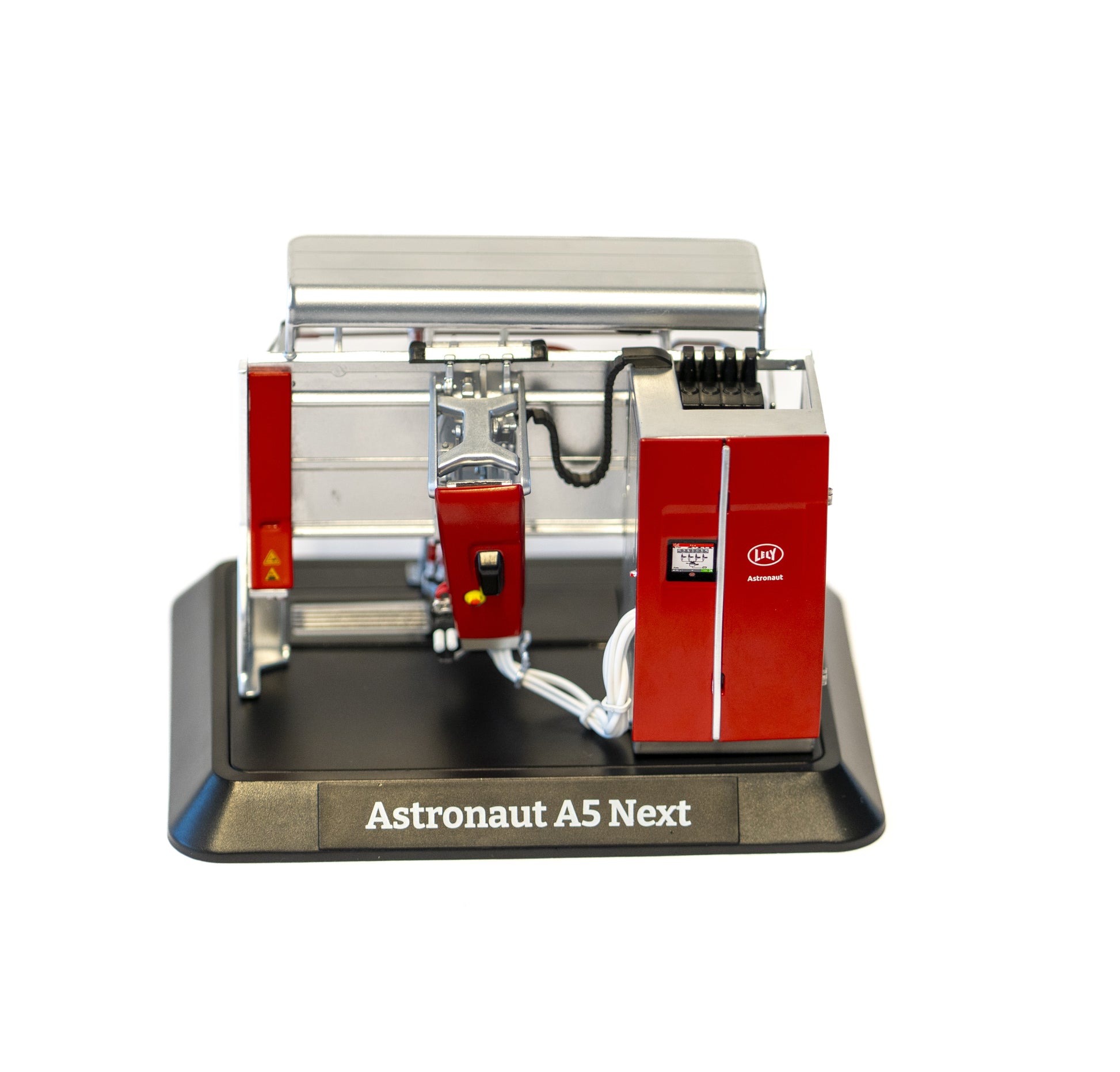 Een levensechte miniatuur van de Astronaut A5 Next. Gebaseerd op de identieke melkrobot, past dit schaalmodel van metaal en plastic, op schaal 1:32 perfect op jouw bureau. Of.. misschien wel leuk als cadeau voor een fan?